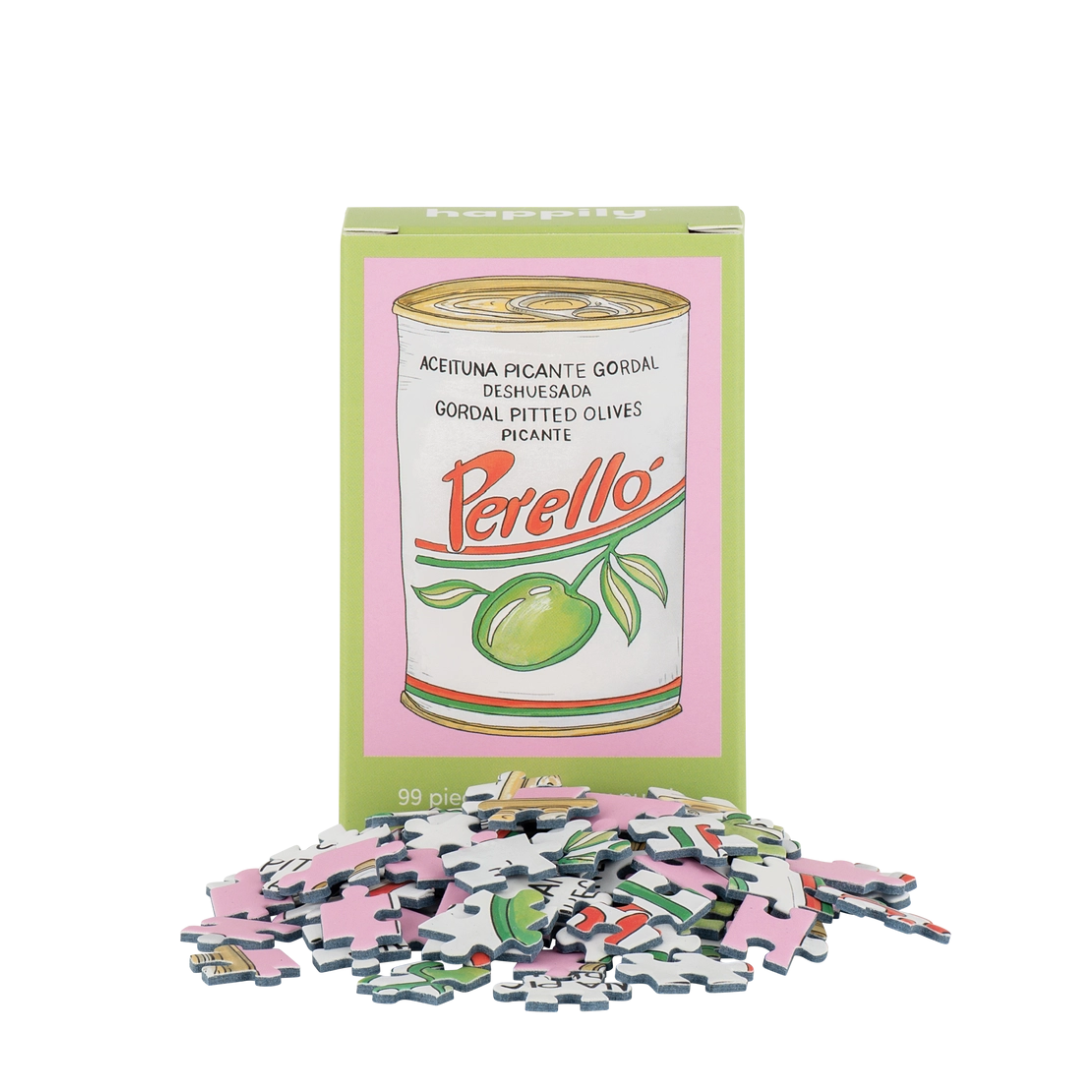 99 Piece Mini Jigsaw Puzzle featuring a fun illustration of can of olives by acclaimed illustrator Natalia Yañez-Stiel. The perfect gift for foodies.