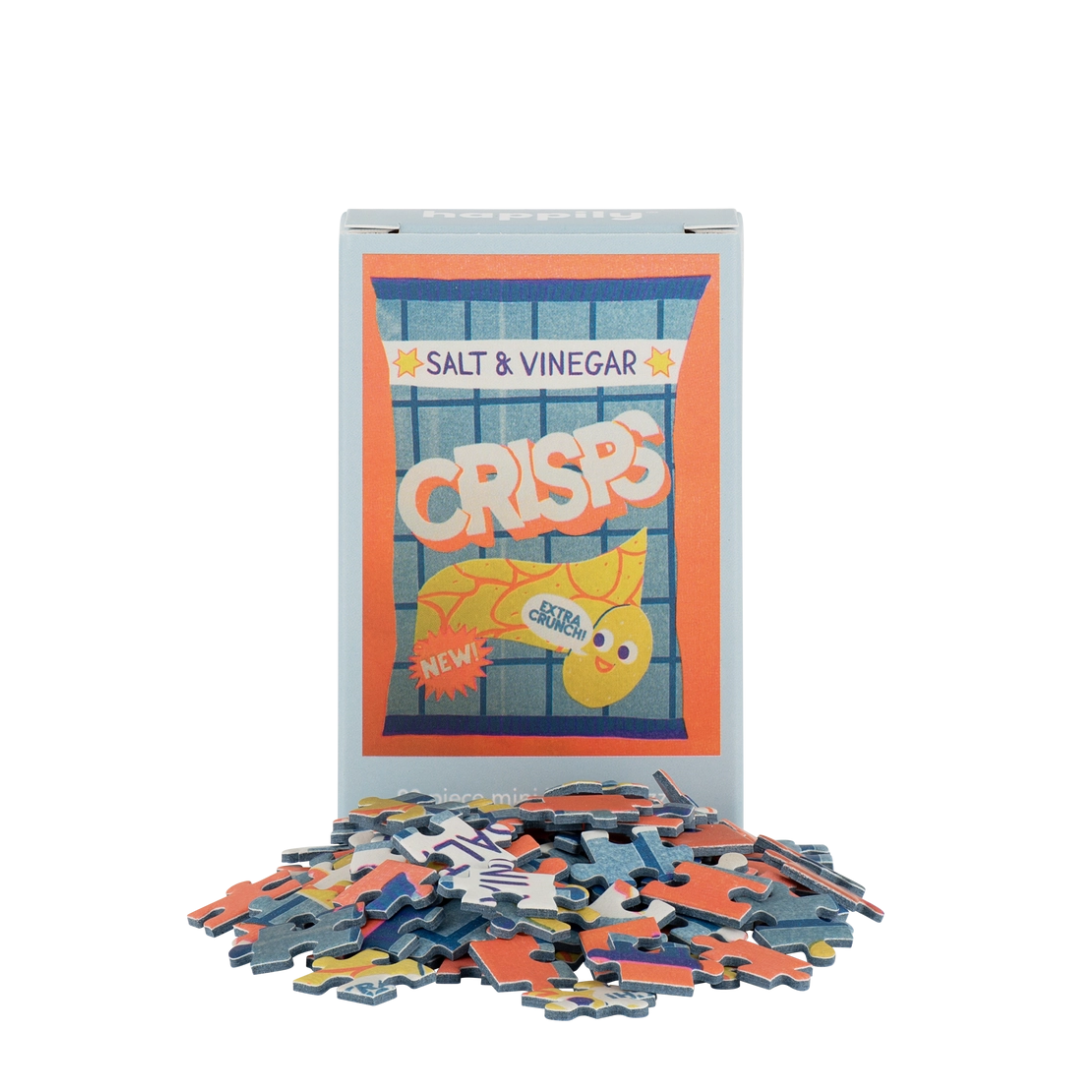 99 Piece Mini Jigsaw Puzzle featuring a fun illustration of crisp packet by Naomi Wilkinson.