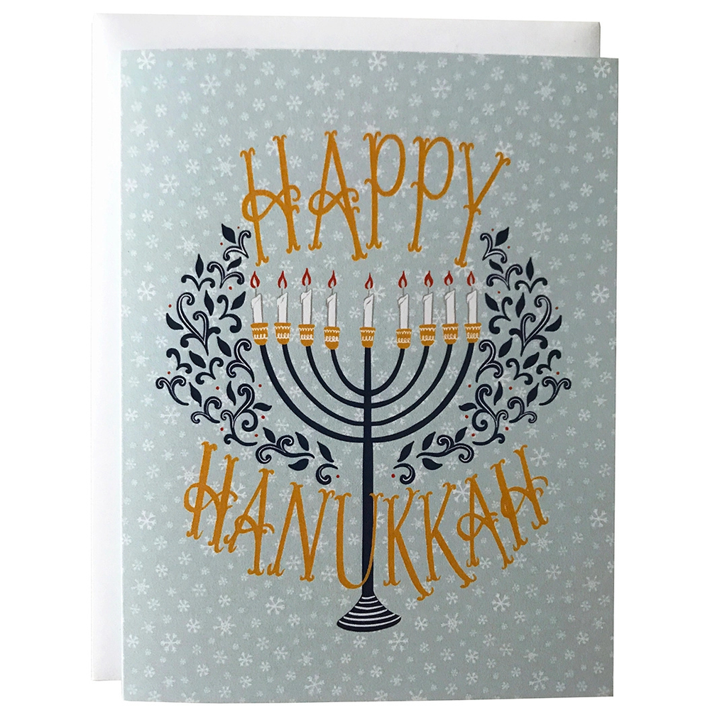 A greeting card with the hand-lettered words "Happy Hanukkah", along with an illustration of a lit menorah, makes a lovely Hanukkah card!