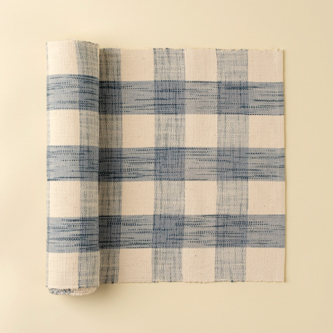 Lay the table with effortless elegance using the Grace Gingham Table Runner. Woven from 100% cotton and handcrafted in India, this extra-long runner brings a beachy, picnic-inspired vibe to your dining table. The soft gingham pattern in muted tones offers timeless appeal, perfect for summer tablescapes, casual gatherings, and coastal-inspired settings. At 108 inches, it’s ideal for family-sized dining tables or outdoor feasts under the sun.