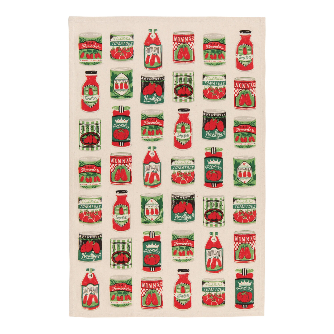 Add life and character to your kitchen with our fun and colorful printed cotton Pomodori dishtowel. A perfect combination of form and function, this towel will make washing up less of a chore. Inspired by vintage market stalls and timeless culinary craft, Pomodori pairs hand-drawn detail with playful lettering and classic red-and-green patterns. Juicy tomatoes, rustic labels, and lush vines evoke a sense of gourmet nostalgia—straight from nonna's kitchen.