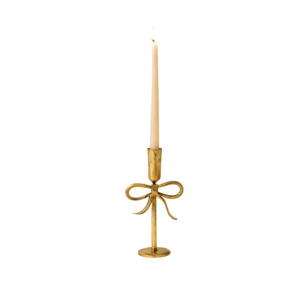 The Bow Candlestick in Gold brings artisanal charm to your decor with its hand-forged bow design, crafted in Moradabad, India. Its delicate, feminine shape and warm gold finish make it ideal for side tables, mantels, or layered tablescapes. Perfect for taper candles, it adds a soft, inviting glow to any space.