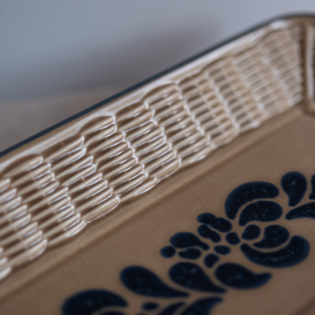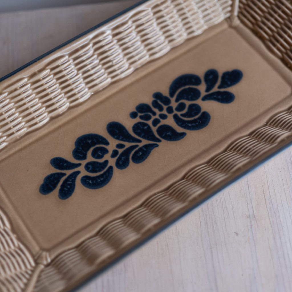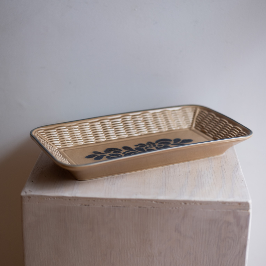 This tray is apart of the Yorketowne Stoneware Pattern, which was produced by Pfaltzgraff in the 1960's. It features a basketweave border with a blue floral design in the center.
