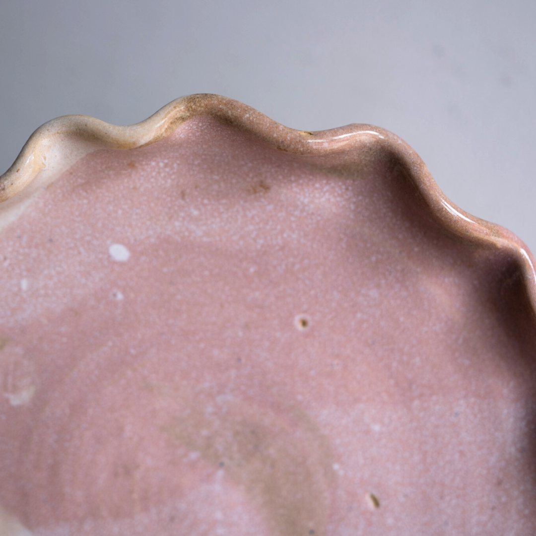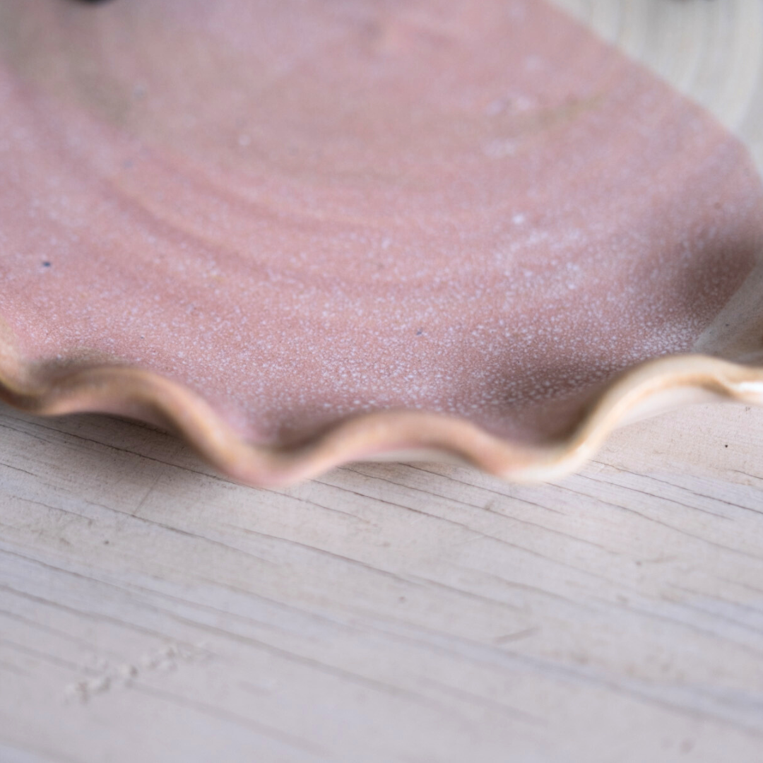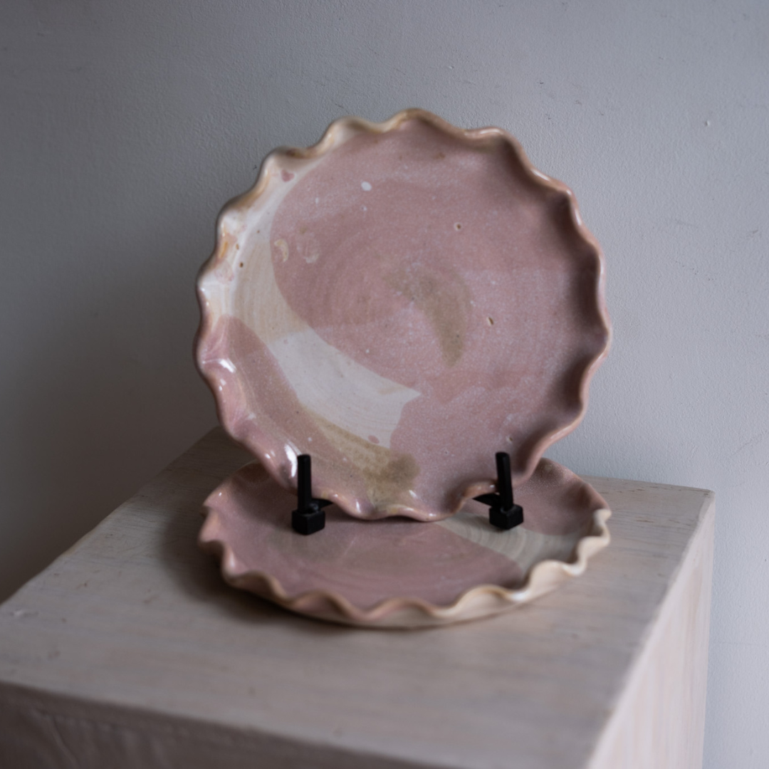 2 beautiful pink and white fluted plates from Dove Pottery in Thunder Bay.