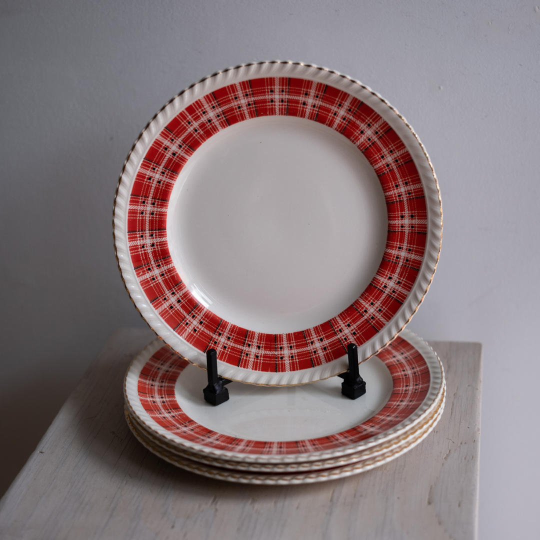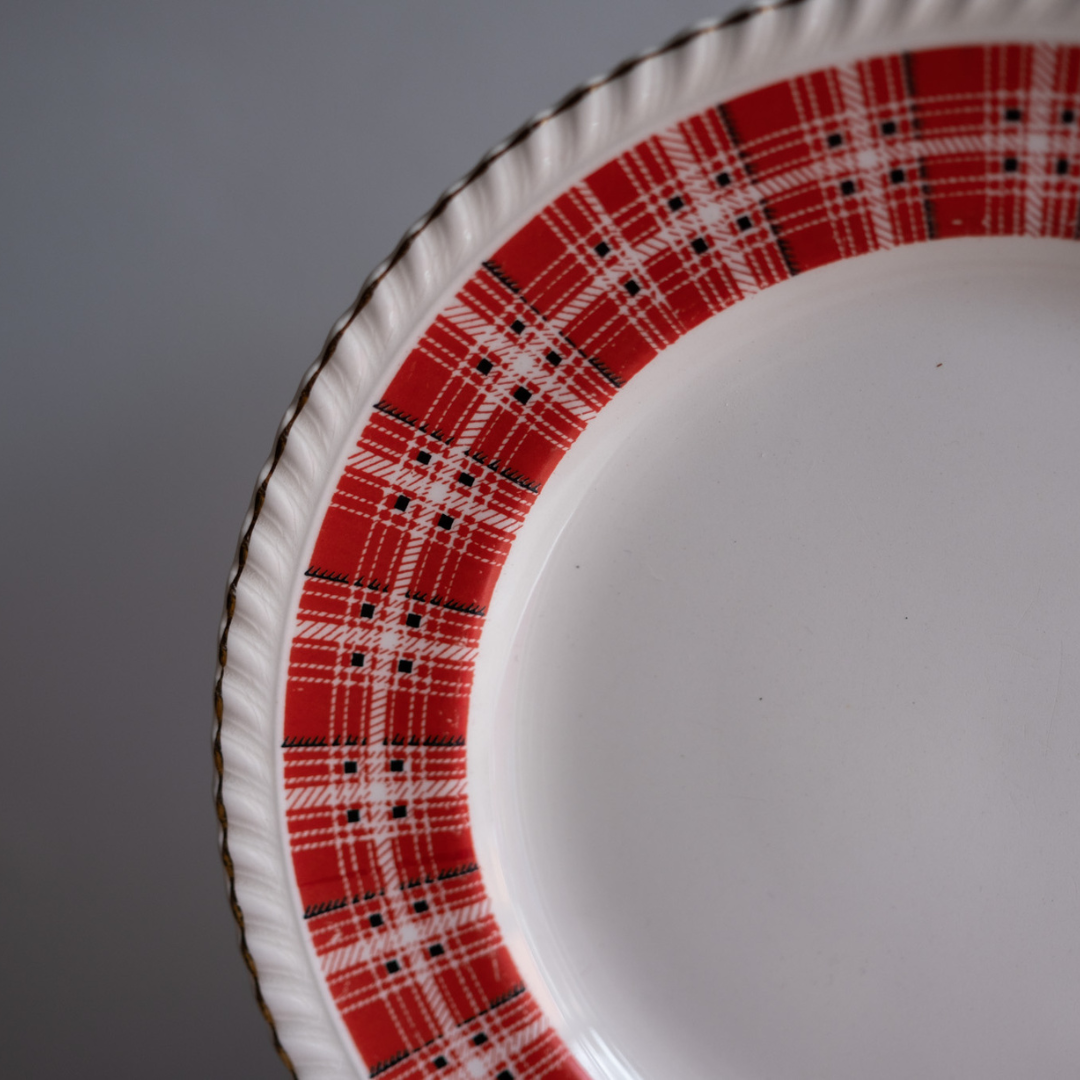 Red, White and black plaid with gold fluted rim.