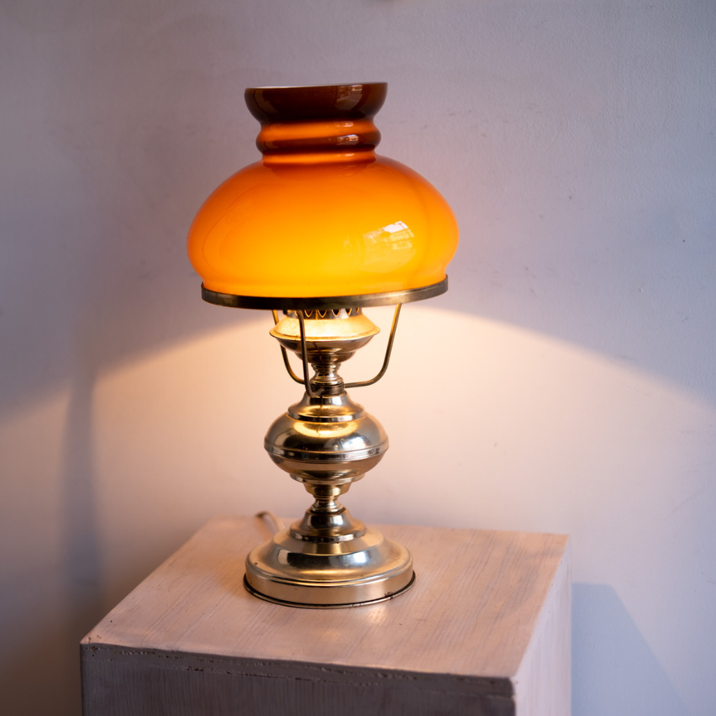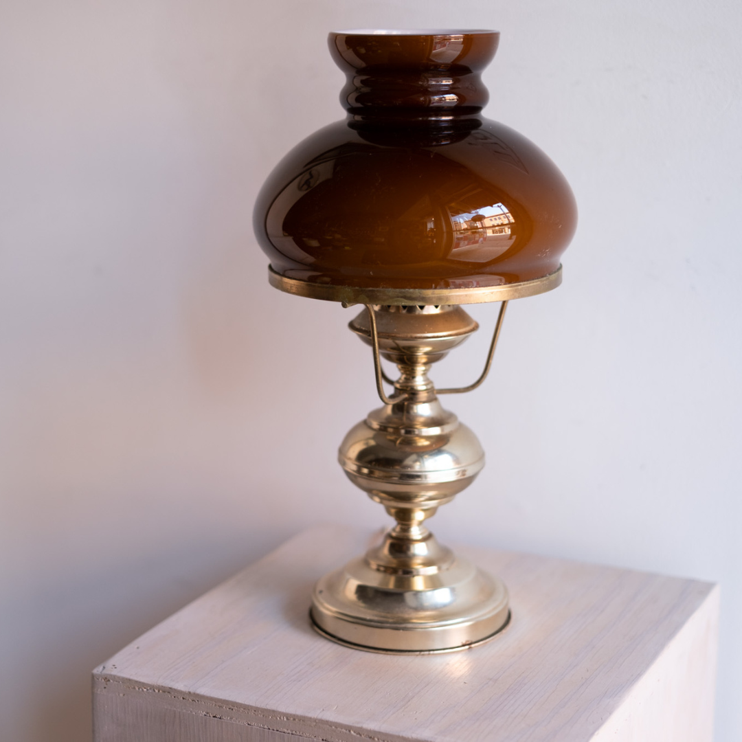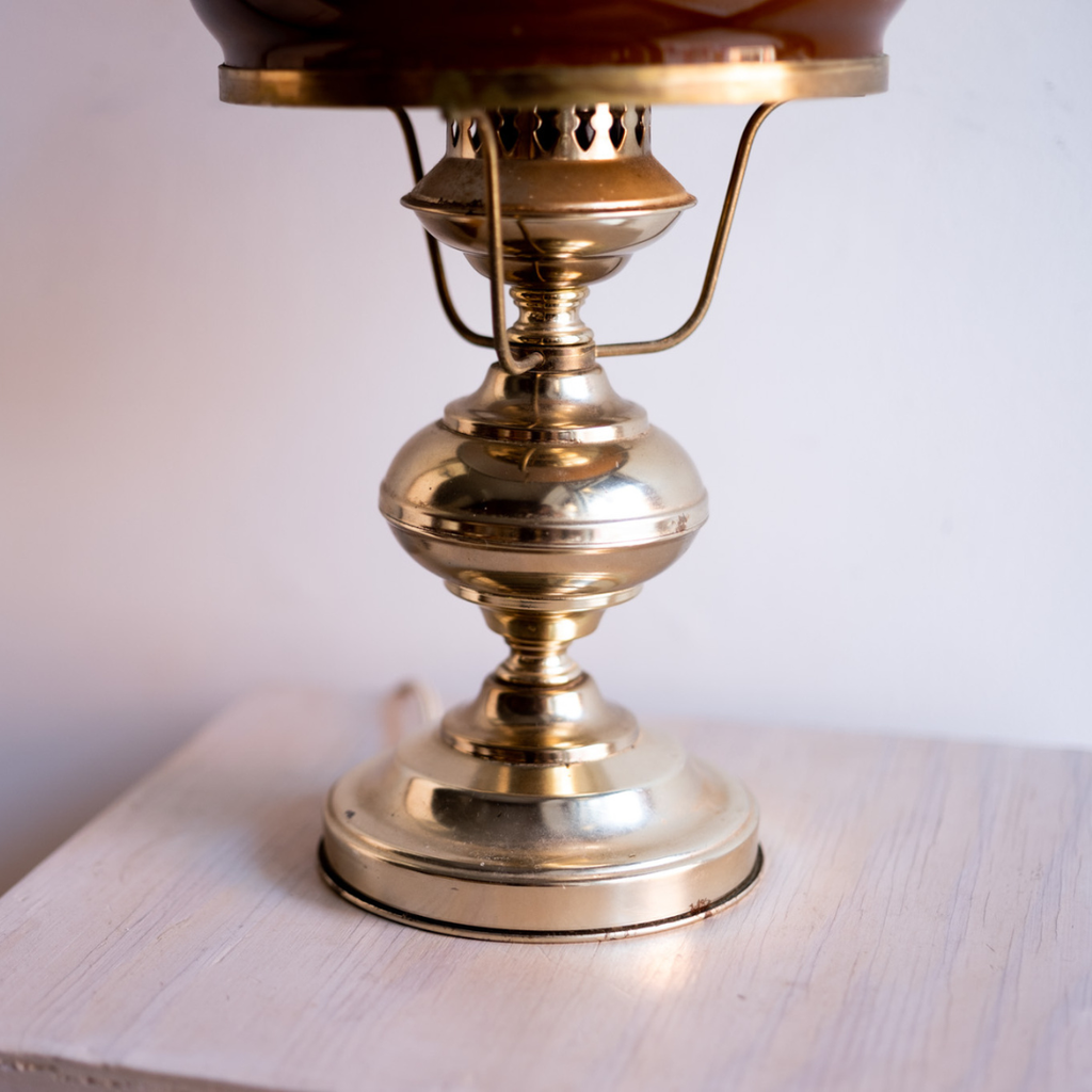 Brass lamp with  amber glass shade.