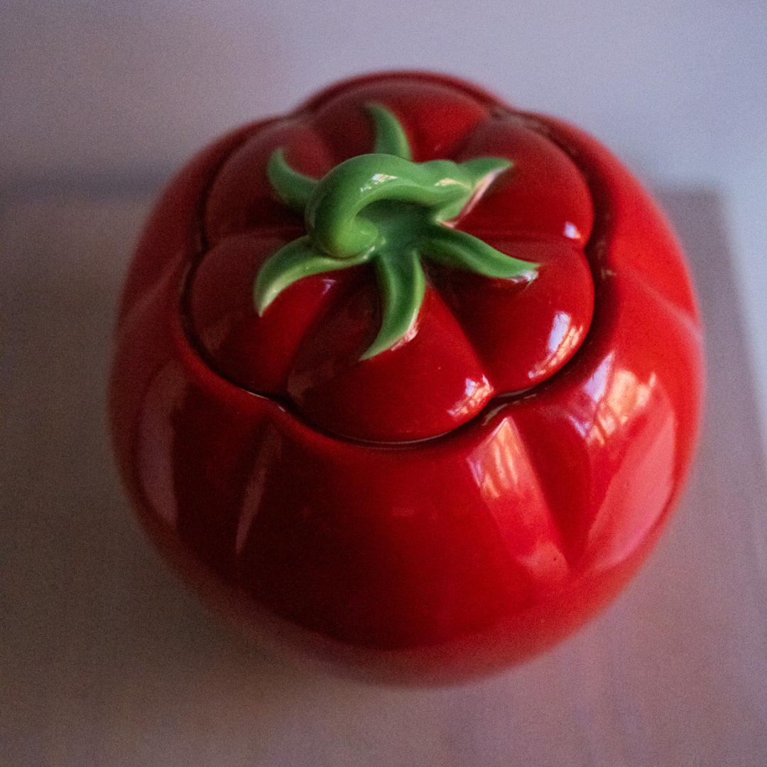 Amazing vintage heavy ceramic tomato shaped cookie jar.