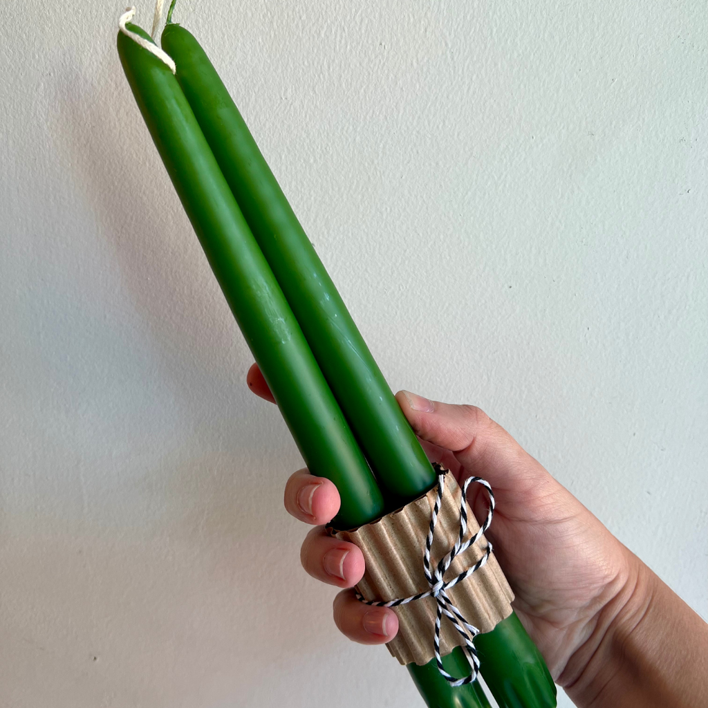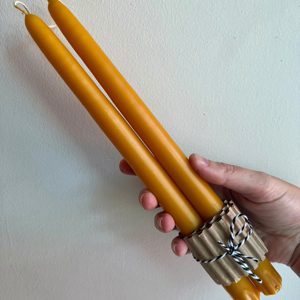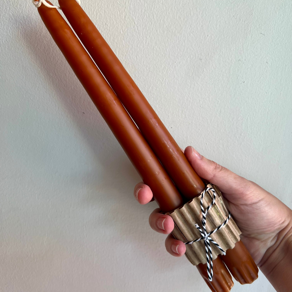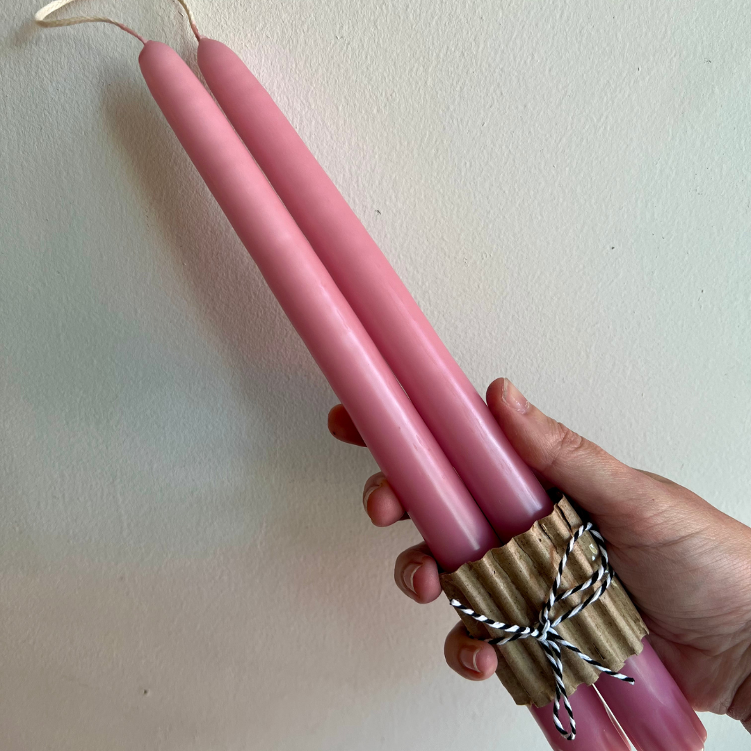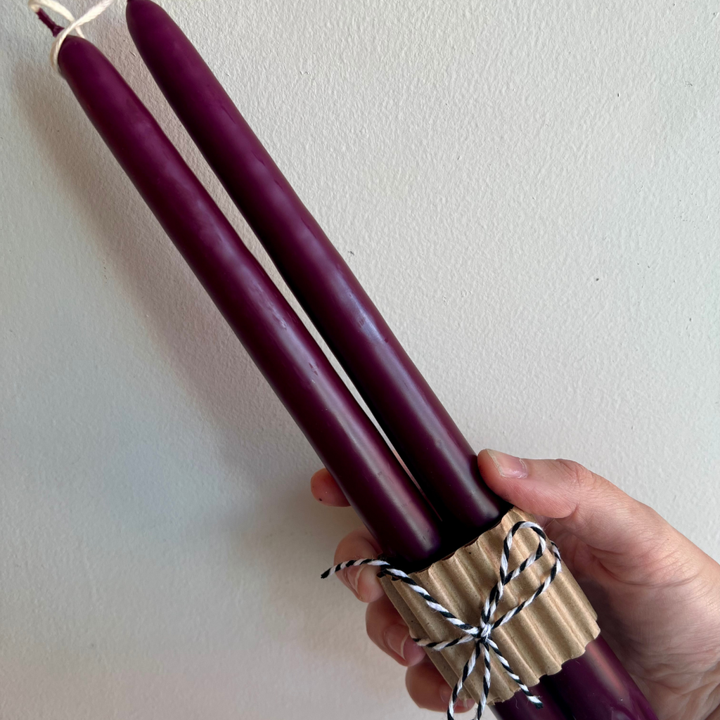 Handcrafted candle in a variety of colours. The interior of the candle remains white ensuring a clean burning and drip-less candle. Crafted from the highest quality food grade paraffin wax and an all cotton wick. The base of the candle is roughly 7/8" and fits any standard taper holder.