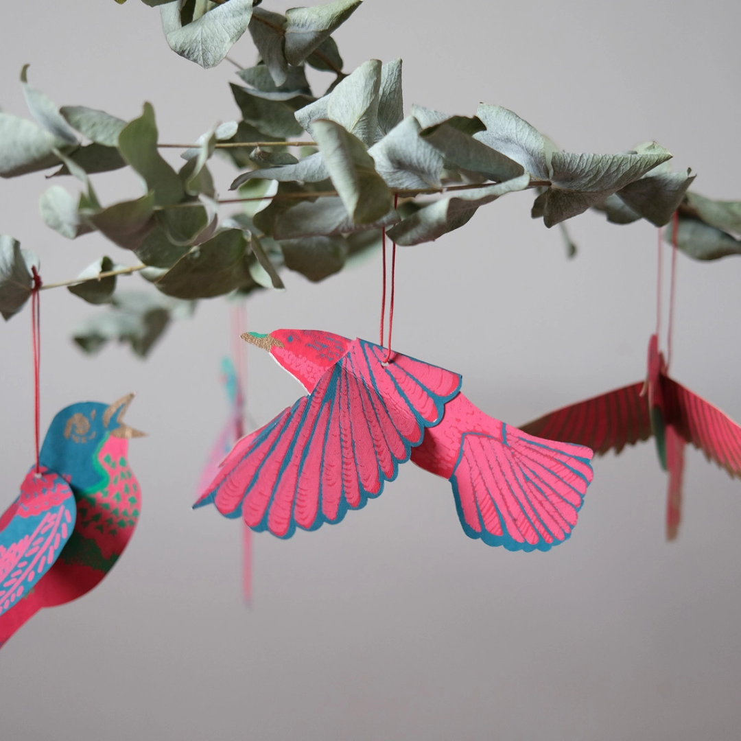 With four jewel coloured birds, this set of paper decorations is inspired by colourful festive ornaments of years past. Each bird has a different design, with wings that fold out.