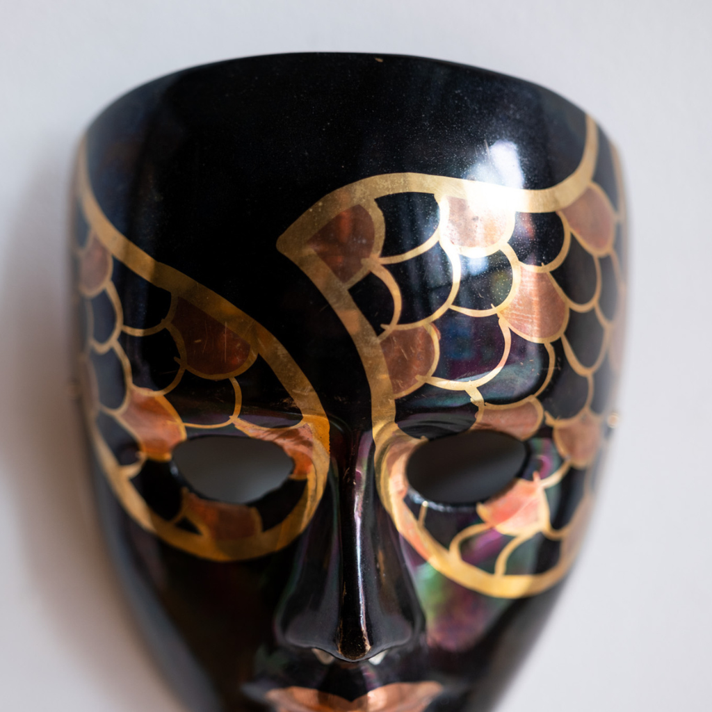 Venetian Mask wall deco. Solid brass, painted in black, gold and bronze with a scallop design.
