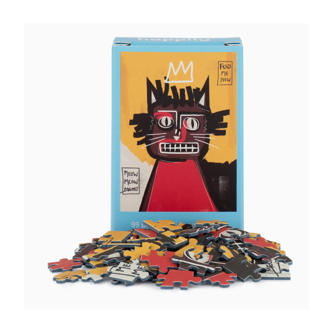 99 Piece Mini Jigsaw Puzzle featuring a fun cat illustration, in the style of Jean-Michel Basquiat by Nia Gould.